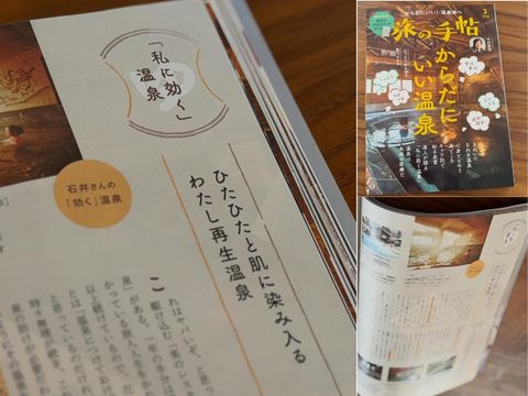 旅の手帖2月号は「からだにいい温泉」大特集。そのなかでもきれいになれる温泉はしっとり、つるすべ、とろとろに分けて15ページ。企画段階から編集チームとやり取りをして関わらせていただけたのもうれしかった。そして、わたしに効く温泉エッセイと最近注目している塩類複合温泉についても執筆しました。温泉もりもりの楽しい一冊です