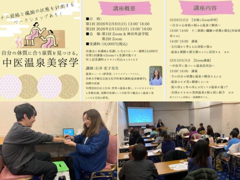 来年の話をすると鬼が笑う?と、申しますが、「もっと早く日程を知りたかった」というお声も多かったので、2026年2月開講の「中医温泉美容学」講座のお知らせです。自分の状態を知り、ちょっと違うアプローチで温泉の活用法を考える講座です。2/8(日)と、2/15(日)の13時〜16時の2回完結。リアル会場とオンライン併用ですが、開催日に都合があわなくてもお申込みいただいた方は後日オンデマンド受講も可能です。